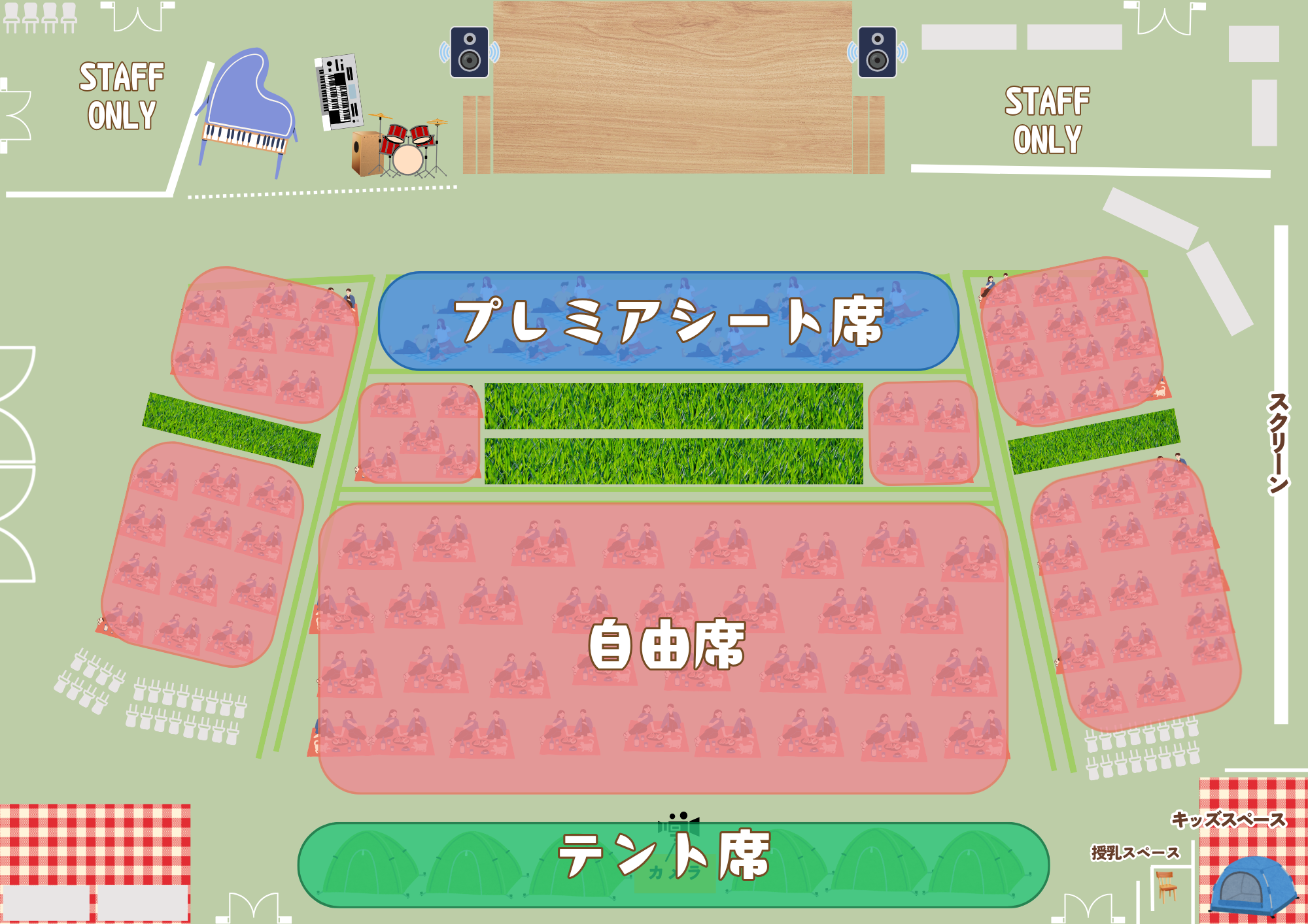 会場後方のテント席(テントは会場側で設置)を事前に確保させて頂きます。
